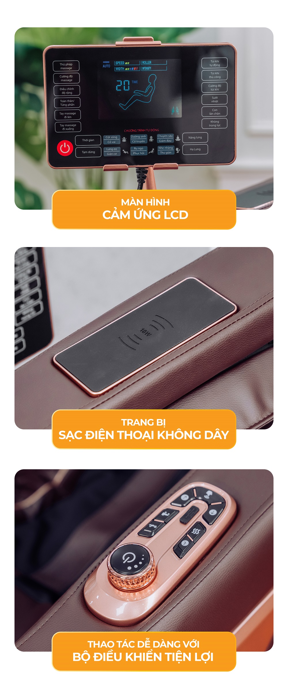 Chương trình tự động 12 chương trình (Doanh nhân, phái nữ, cổ – vai, lưng – eo, ngủ ngon, kéo giãn, massage Trung Hoa, cổ điển, nhẹ nhàng, giảm đau, văn phòng, phục hồi)